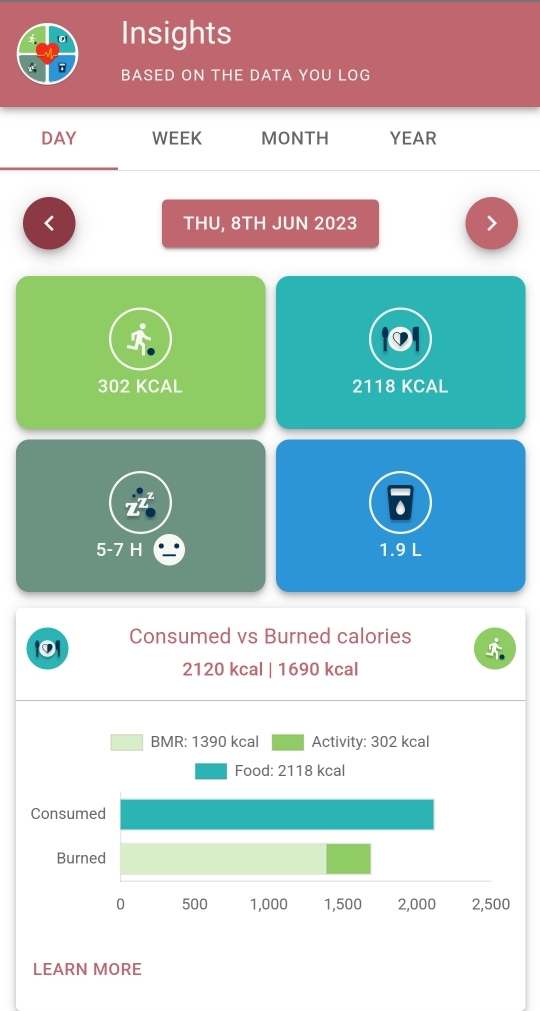You can log your food and water intake, your exercise/activities, and your sleep daily. See how these affect each other, through combined insights – a complete overview in one convenient place!